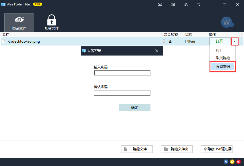 Wise Folder Hider 支持对 3 种类型的项目设置二级密码:对隐藏的文件和文件,对隐藏的U盘,对加密保险箱。设置二级密码的方式是相同的。