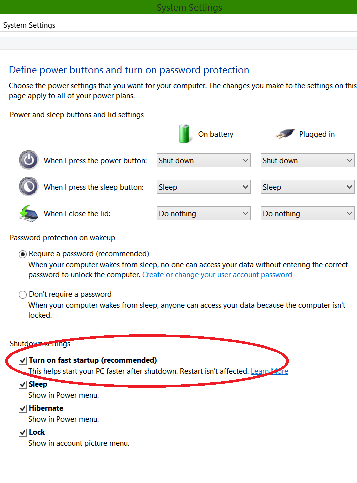 NOTE: If the Turn on fast startup setting is not listed, then you will need to close the System Settings window, enable hibernate, then start back at step 1 again.