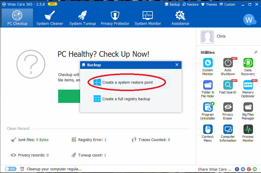 It is easier if you use the ‘Backup’ feature of Wise Care 365, it just takes 2 steps: