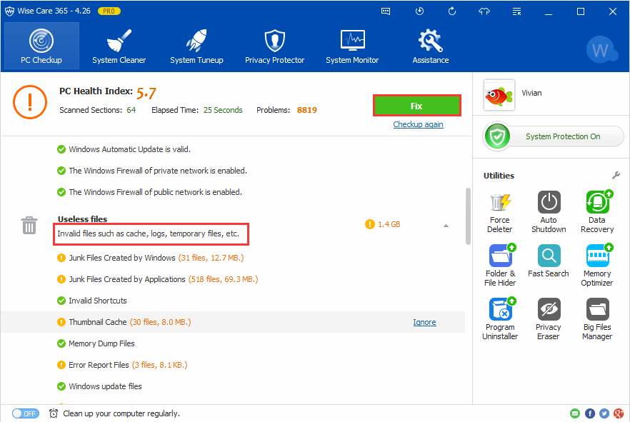 Click “Checkup” and it will scan and list some useless files including temporary files. And then click “Fix” to remove them completely.